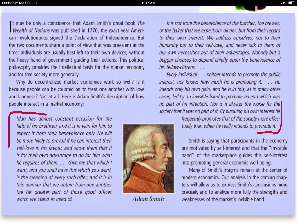 In such interaction, everyone is first to satisfy one's own needs rather than helping a fellow man. In doing so, the benefits or 'benevolent' is not promoted as public interest but self interest as Adam Smith put it as 'self-love' or 'own gain'.