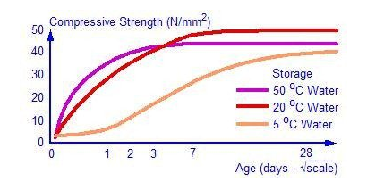 However, the final strength of the concrete kept at the higher temperature will be lower. This is because the physical form of the hardened cement paste is less well structured and more porous when hydration proceeds at faster rate.