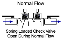 It consists of two check valves assembled in series.[1] This employs two operating principles: firstly one check valve will still act, even if the other is jammed wide open. Secondly the closure of one valve reduces the pressure differential across the other, allowing a more reliable seal and avoiding even minor leakage.