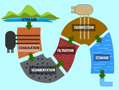 The processes involved in removing the contaminants include physical processes such as settling and filtration, chemical processes such as disinfection andcoagulation and biological processes such as slow sand filtration.