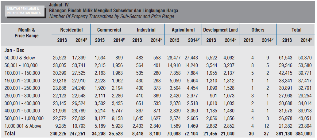 From the 2014 Annual Property Market Report, the total transaction for the year 2014 was 384,060. The various sub-sectors were: