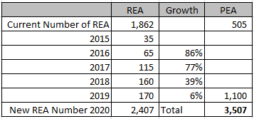 Current numbers 2015 - 1,862 (REA), 505 (PEA) addition of 65 REA in 2 years.