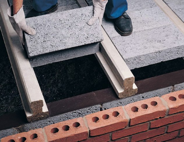The pre-cast reinforced concrete beams are laid in rows in a similar fashion to traditional timber joists, with their ends resting on the inner leaf of the main walls over the damp-proof course (DPC).