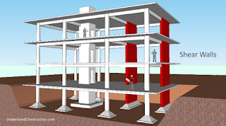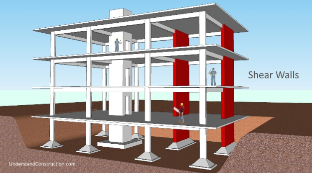 Shear Walls are important structural elements in high-rise buildings. Shear walls are essentially very large columns - they could easily measure 400mm thick by 3m long - making them appear like walls rather than columns. Their function in a building is to help take care of horizontal forces on buildings like wind and earthquake loads. Normally, buildings are subject to vertical loads - gravity. Shear walls also carry vertical loads. It is important to understand that they only work for horizontal loads in one direction - the axis of the long dimension of the wall. These are usually not required in low-rise structures.